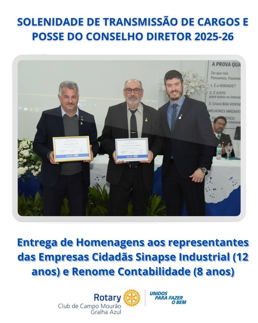 No dia 24/06/2025, dentro da Solenidade de Transmissão de Cargos e Posse do Conselho Diretor do Rotary Club de Campo Mourão-Gralha Azul para o ano rotário 2025-26, sob a mensagem presidencial "Unidos para fazer o bem", realizamos a homenagem às empresas cidadãs Sinapse Industrial e Renome Contabilidade em razão ao tempo que essas empresas contribuem ao Rotary Club de Campo Mourão-Gralha Azul.