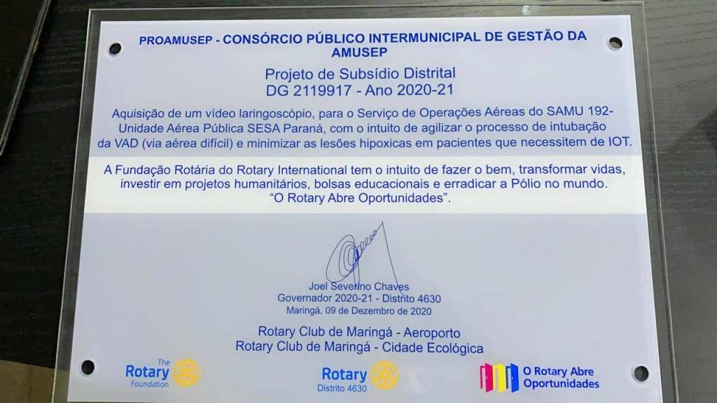 O Projeto de Subsídio Distrital elaborado pelo Rotary Club de Maringá-Aeroporto em parceria com o Rotary Club de Maringá-Cidade Ecológica foi aprovado pela Fundação Rotária e beneficiará o atendimento de pacientes em estado grave de urgências e emergências pelo Serviço Aeromédico do SAMU. A base de Maringá ainda não possuía o videolaringoscópio. A entrega do aparelho aconteceu na PROAMUSEP - Consórcio Público Intermunicipal de Gestão da AMUSEP (Associação dos Municípios do Setentrião Paranaense).