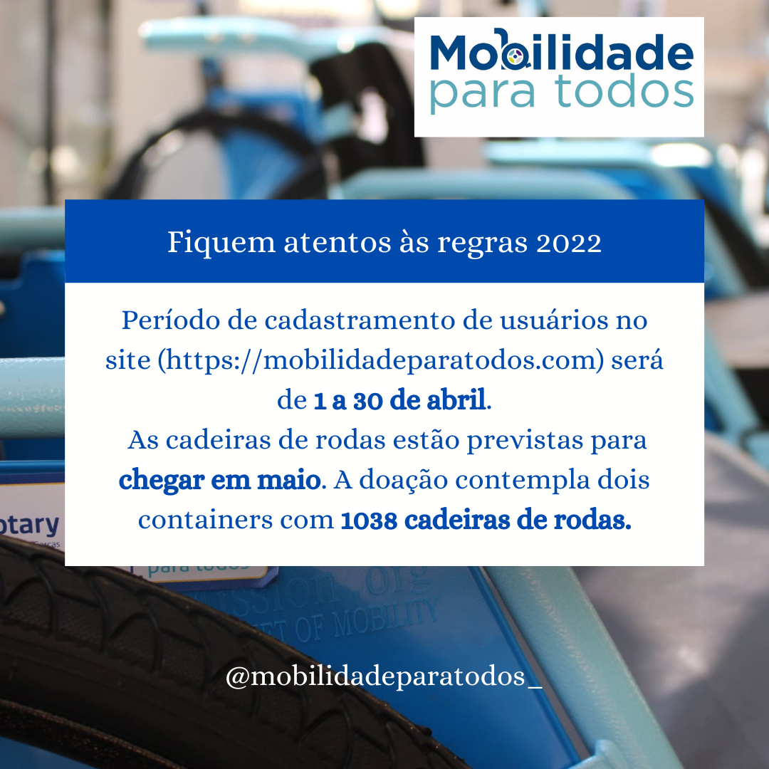 A comissão do programa Mobilidade para Todos estabeleceu regras para solicitação e distribuição das cadeiras de rodas. Para mantermos a parceria com cada Rotary Club todas as regras abaixo deverão ser