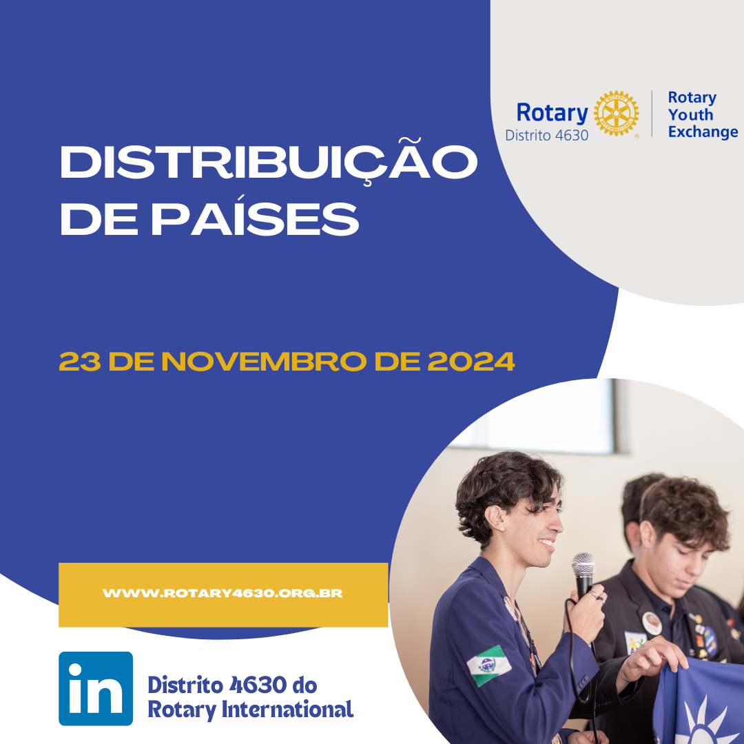 O Distrito 4630 do Rotary International TORNA PÚBLICO o presente Edital, que convoca para o IV ENCONTRO DE TREINAMENTO DOS OUTBOUNDS que ocorrerá no dia 23/11/2024 (sábado), às 8h, na Casa da Amizade de Maringá, onde ocorrerá a Distribuição de Países do Programa de Intercâmbio de Jovens de Longa Duração do Distrito 4630.