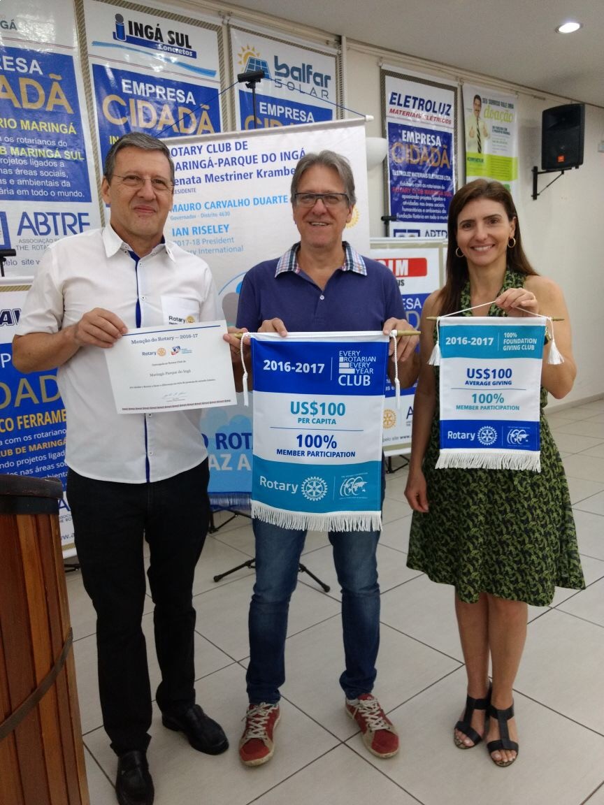 Governador 16/17 Renato Iurk entrega Menção Presidencial e duas flâmulas de Rotary International contemplando EREY - Every Rotarian Every Year  (Todo rotariano todos os anos) e 100% da participação de doadores contribuintes com US$ 100,00 per capita à Fundação Rotária.