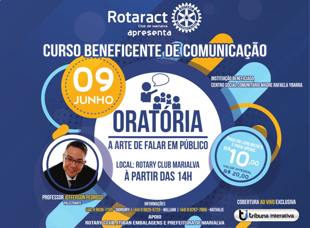 O Rotaract Club de Marialva, no dia 09 de junho (sábado), a partir das 14h, na sede do Rotary Club (Avenida Cristóvão Colombo, n.º 833, Centro), promove o Curso Beneficente de Comunicação com o tema “ORATÓRIA: A ARTE DE FALAR EM PÚBLICO”.