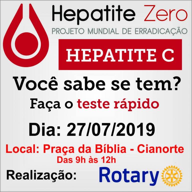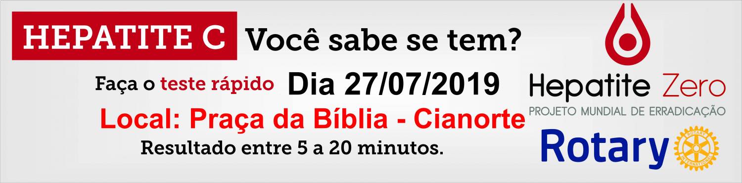 O Rotary Club de Cianorte Cinturão Verde e a Associação Brasileira dos Portadores de Hepatite, realizam um mutirão de testes rápidos de Hepatite C, direcionado para homens e mulheres com mais de 40 anos.