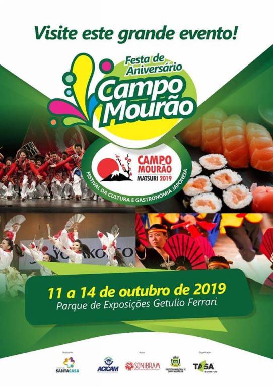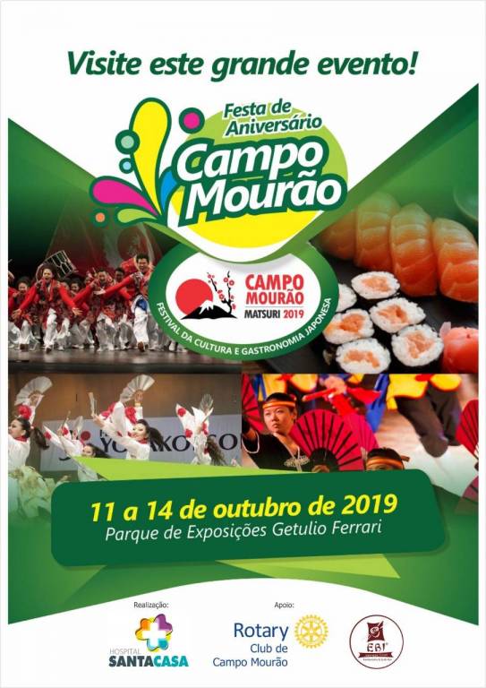 De 11 a 14 de outubro o Rotary Club de Campo Mourão também estará presente no Parque de Exposições Getúlio Ferrari, em parceria com o Restaurante Ebi, durante o "Matsuri" 2019. Um belíssimo festival de cultura e gastronomia japonesa para marcar o aniversário de 72 anos do município. O evento será realizado em prol da Santa casa de Campo Mourão. Sua participação é muito importante.